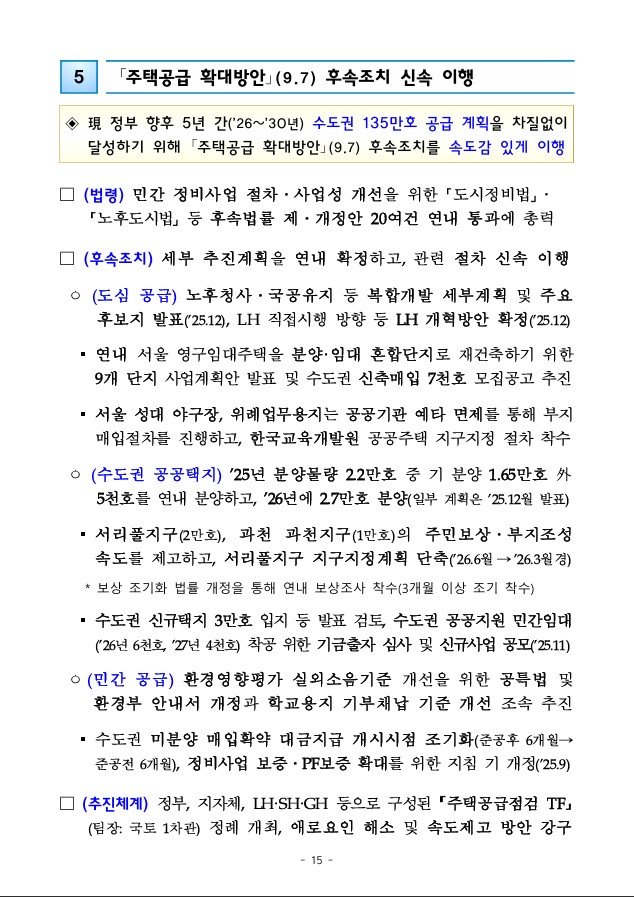 ‘공급확대방안’(9월 발표)의 후속조치로 재건축·재개발 절차 간소화, 도심 내 신속통합기획,