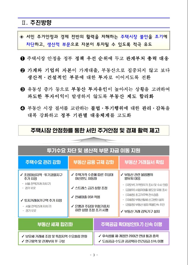 ① 서울 전역 규제 강화, ② 대출 총량 관리, ③ 공급 확대입니다.