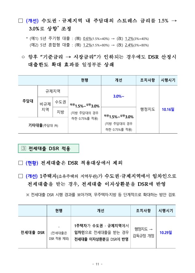 1주택자가 수도권이나 규제지역에서 전세를 얻기 위해 전세대출을 받으면 이자상환분이 DSR에 반영됩니다. 무주택자·지방은 향후 단계적으로 확대할 예정입니다.